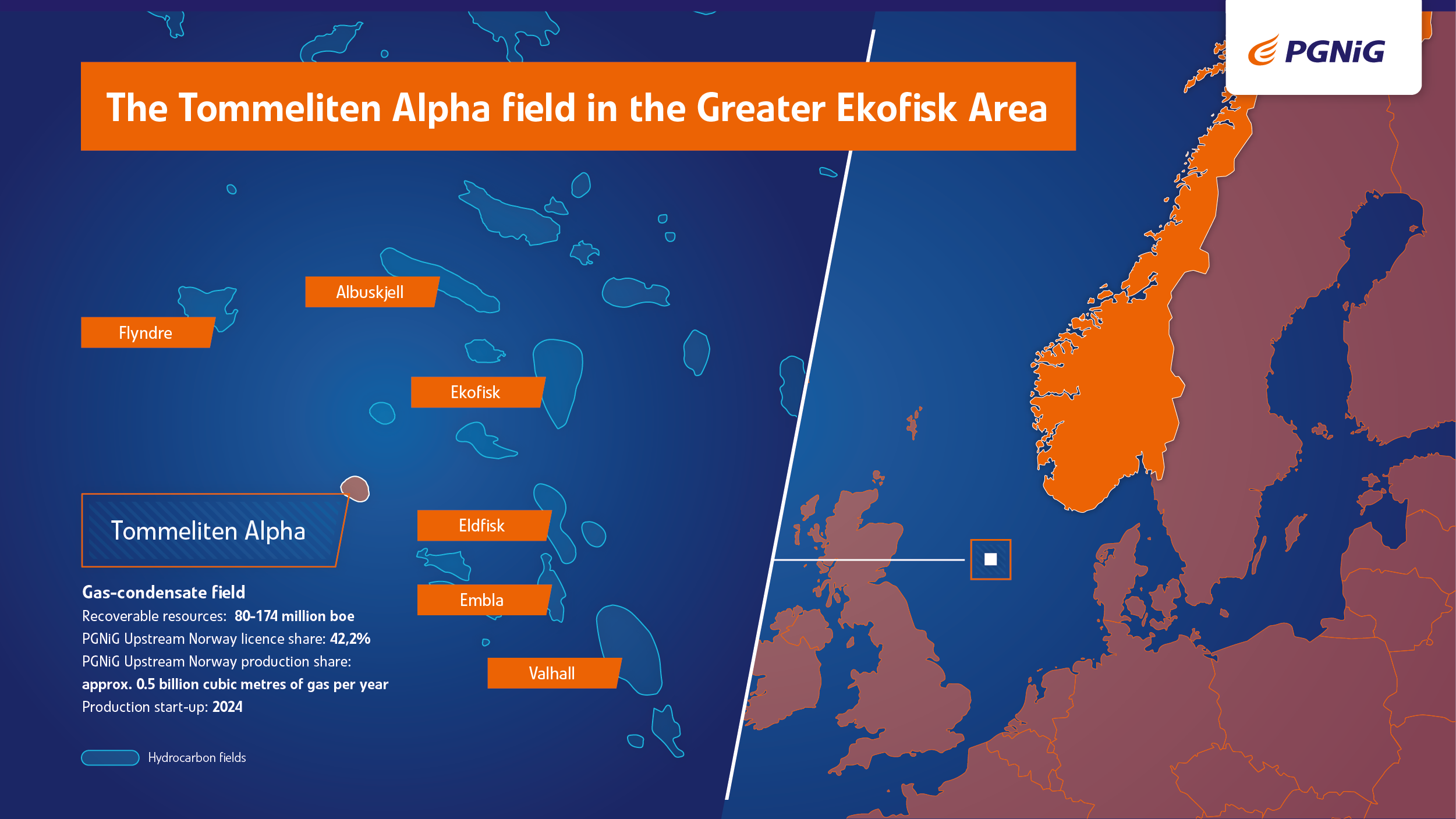 The Tommeliten Alpha is a gas-condensate field whose recoverable resources, consisting mainly of gas condensate, have been estimated at 80-174 million barrels of oil equivalent, of which PGNiG’s share is 33-73 mmboe. The production volume for PGNiG will be approx. 0.5 billion cubic metres of gas per year in the peak period.